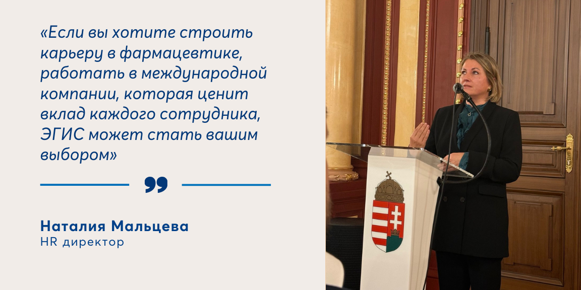 Одним из ключевых спикеров стала Наталия Мальцева, HR-директор ЭГИС-РУС. В своём выступлении она подчеркнула важность международного сотрудничества и роль молодых специалистов в развитии фармацевтической отрасли. Наталия рассказала о компании ЭГИС, одном из лидеров фармацевтического рынка Центральной и Восточной Европы и её более чем 110-летней истории, инновациях и миссии по улучшению качества жизни людей.